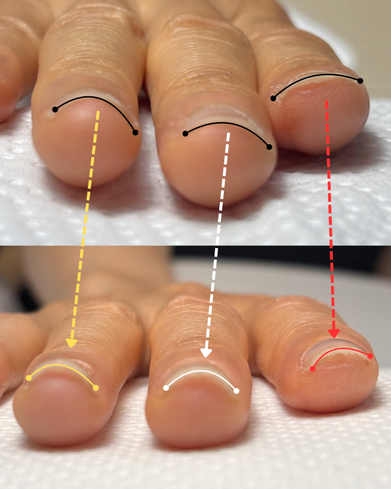 平らな爪とカーブのある爪で比較すると、カーブのある爪の方が強度も強く、そして、フォルムも綺麗に見えます。