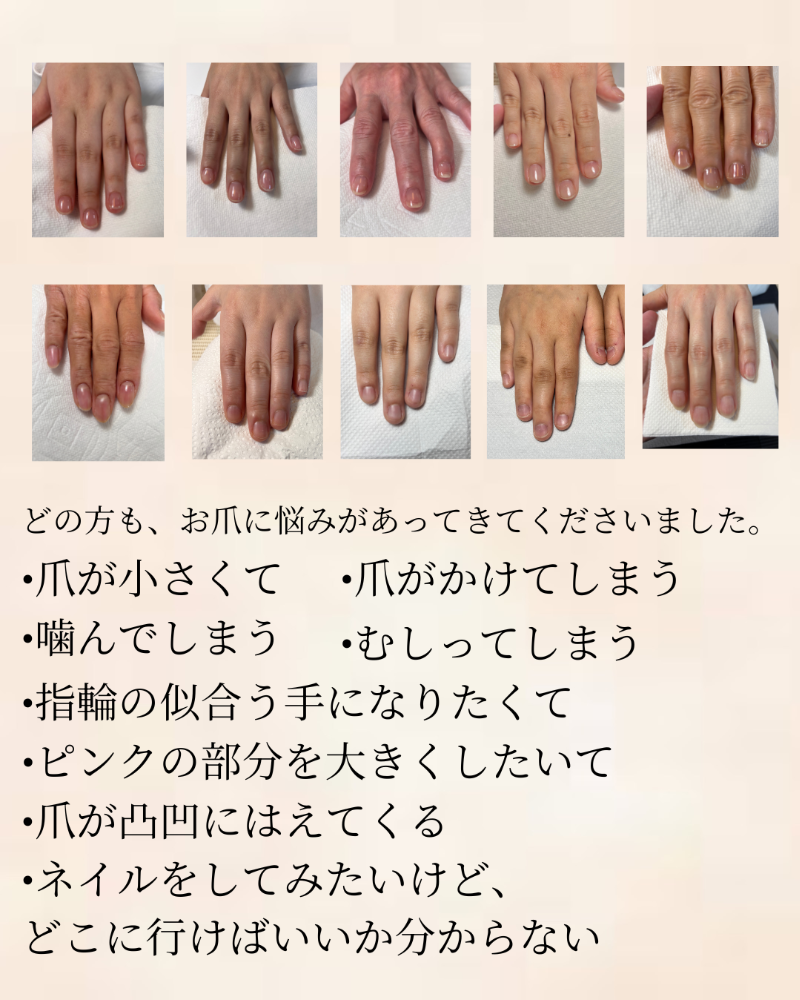 人の考えや好み、性格なども一人ひとり違うように、爪の悩みも十人十色だなと感じた今日。